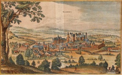 Blamont (The French town Blâmont) – coloured etching